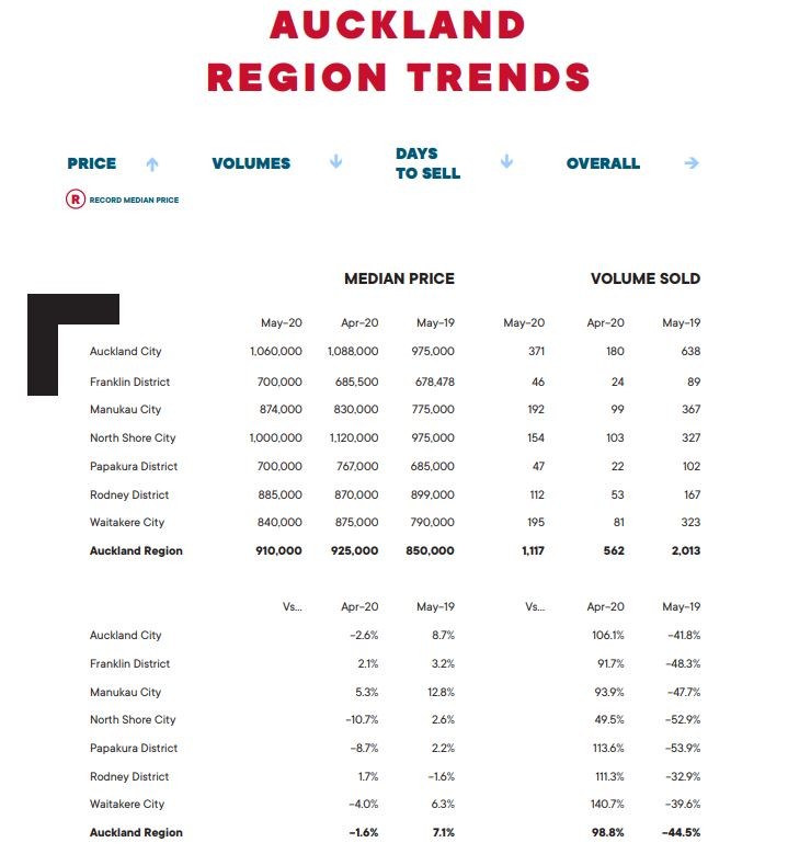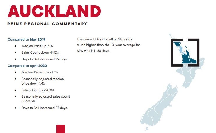 In Auckland, the market has remained stable with a median price of $910,000, up 7.1% year-on-year, and an increase across all Districts except Rodney District, which dropped from $899,000 in May 2019 to $885,000 in May 2020. Days to sell increased by 16 days from 45 days in May 2019 to 61 days in May 2020, likely the result of many of the sales in May that were listed prior to lockdown in March. Market activity should continue to be steady over the next month or two before the normal winter slow down.”